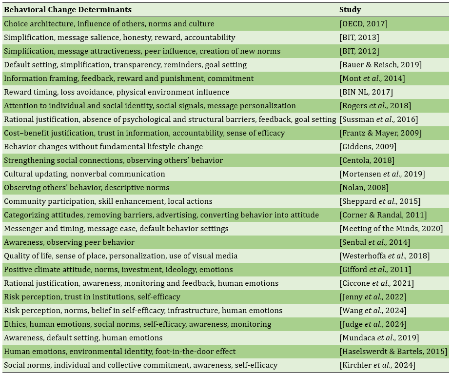 The findings of this study are largely consistent with previous research, indicating that various behavioral factors play a crucial role in shaping citizens’ environmental choices and reducing greenhouse gas emissions. Choice architecture, including sub-indicators such as infrastructure and default rules, had a significant impact on sustainable behavior, aligning with the findings of Sovacool et al. [2020] and Muñoz et al. [2019], although budgetary and planning constraints can limit its effectiveness [Stern, 2008]. Nudge policies and default options also correspond with the studies of Thaler & Sunstein [2008] and Johnson et al. [2012], though cultural factors may reduce their impact [Newel & Siikamaki, 2014]. Findings related to individual and social identity and social norms align with Lu et al. [2023] and Fielding & Hornsey [2016], showing that identity and social pressure reinforce pro-environmental behaviors. The roles of social capital and citizen participation correspond with Putnam [2000] and Wüstenhagen et al. [2007], while monitoring and personalized feedback mechanisms, as noted by Abraham et al. [2007] and Bird & Legault [2018], facilitate behavioral change. Additionally, emotional factors and place attachment, supported by Ojala [2012] and Scannell & Gifford [2010], underscore the importance of interactive and aesthetically designed urban spaces in promoting environmental behaviors.