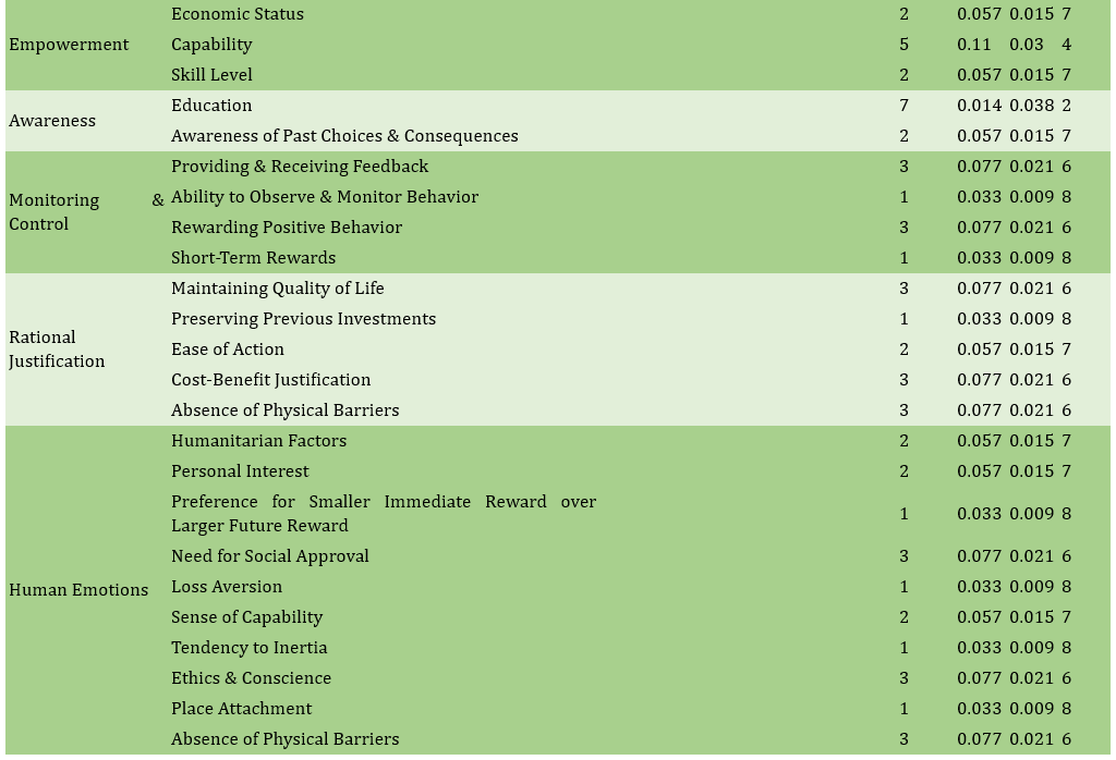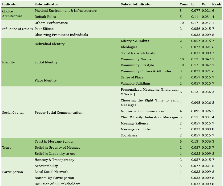The findings of the study indicated that among the selected articles, a total of 52 sub-codes were initially identified, which were subsequently merged and redefined into 19 main codes and ultimately categorized into 7 key indicators (Table 1). Analysis of these indicators revealed that identity, influence from others, and choice architecture were the most significant and frequently cited factors shaping behavioral insights (Table 2). Within the choice architecture indicator, default rules were more influential than the physical environment and infrastructure. For the influence-from-others indicator, the behavior of peers had the greatest impact, whereas observing the actions of prominent individuals had the least significance. Regarding identity, social norms and collective lifestyle were the most critical, while individual identity ranked lower. Social capital was primarily affected by appropriate social interactions and trust, with message salience and reminders being less impactful. Capability largely depended on economic status and skills, receiving lower priority. Awareness was dominated by education and knowledge of past decision outcomes. Finally, in monitoring and control, feedback and rewarding positive behavior were most prominent. Overall, based on average rankings, choice architecture, identity, and influence from others held the highest priority, whereas monitoring and control and human emotions were least influential in shaping behavioral insights relevant to urban design policies and greenhouse gas reduction.