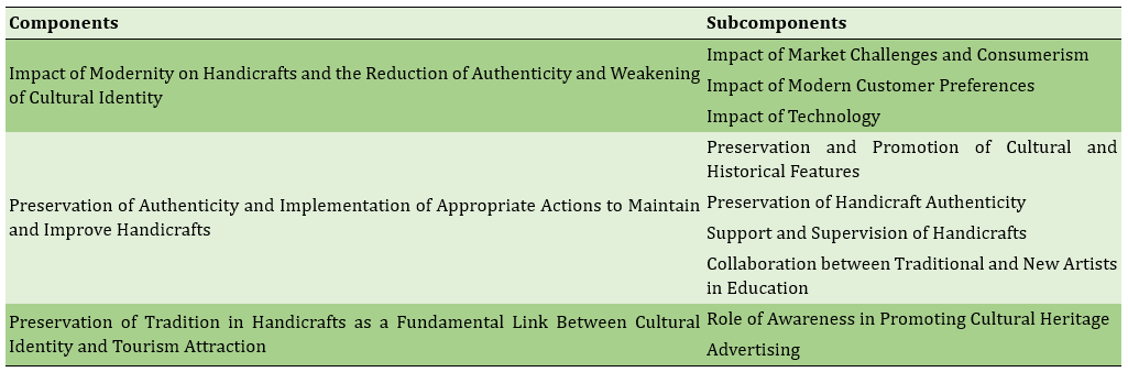 According to handicraft practitioners in Natanz, a harmony between tradition and modernity in heritage tourism attractions is achievable. Traditional handicrafts of the region can meet modern tastes and needs without losing their authenticity and cultural identity. The study identified three main parameter: “The Impact of Modernity on Handicrafts,” “Preservation of Authenticity and Implementation of Proper Measures,” and “Preserving Tradition as a Link Between Cultural Identity and Tourism Attractions”, each consisting of relevant sub-components (Table 1).