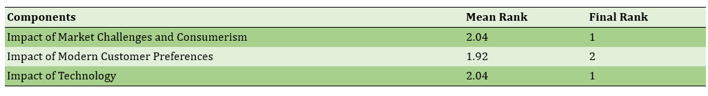 The Friedman test for the “Impact of Modernity on Handicrafts” parameter showed that “Market Challenges and Consumerism” and “Technological Impact” ranked first as the most influential factors in diminishing authenticity and weakening cultural identity, followed by “Modern Customer Preferences” in second place (Table 3).
