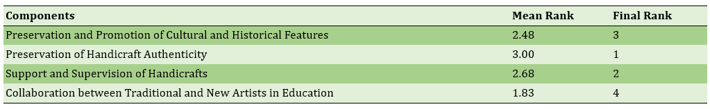 Table 4. Ranking of components of the parameter of "Implementing Appropriate Measures to Preserve and Improve Traditional Art Features"