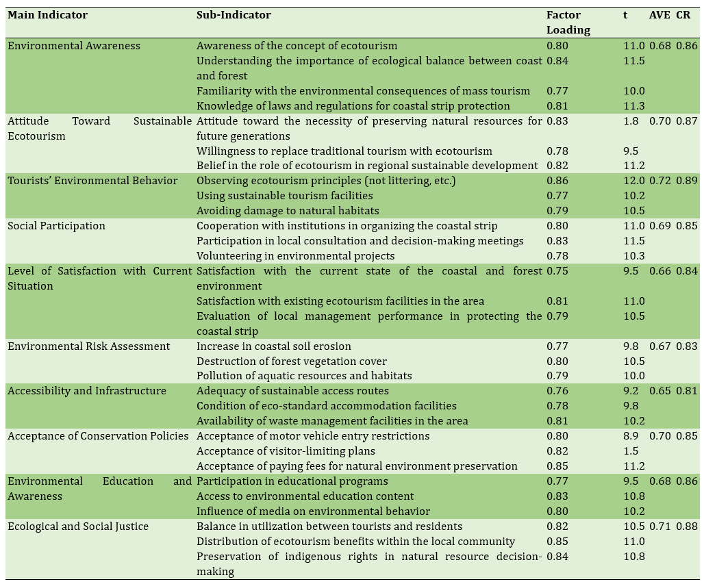 In this study, the indicators and sub-indicators influencing the management of the Gisum coastal strip were first identified (Table 1). Confirmatory factor analysis revealed that all factor loadings exceeded 0.7, and the indicators demonstrated satisfactory convergent validity (AVE: 0.65–0.72) and composite reliability (CR: 0.66–0.71). Among them, tourists’ environmental behavior had the highest factor loading, while ecological and social justice also showed high validity and reliability. Other indicators, including environmental awareness, attitudes toward sustainable ecotourism, social participation, satisfaction levels, environmental risk assessment, access and infrastructure, acceptance of conservation policies, and environmental education, also exhibited strong factor loadings and were statistically validated (Table 1).