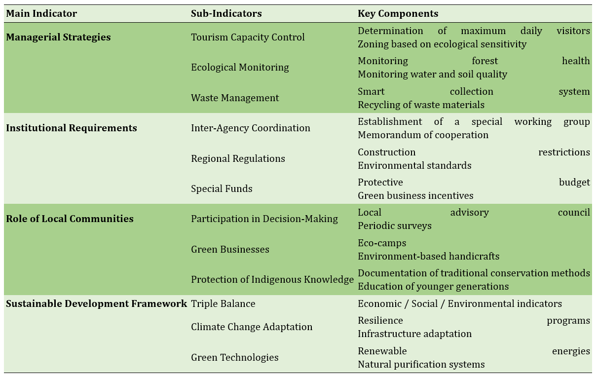 The proposed conceptual model illustrates a dynamic and networked interaction among these four pillars (Figure 1). Management strategies relied on institutional support, local communities facilitated the implementation of these strategies, and the sustainable development framework provided feedback for continuous system improvement. Causal relationships among components, such as the effect of tourism capacity control on ecological balance and the influence of local participation on waste management effectiveness, were incorporated into the model, ensuring that changes in any component produced systematic effects across other elements (Figure 1).