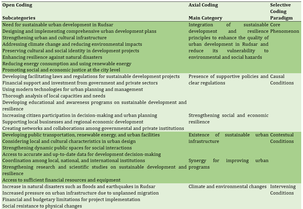 The integrated conceptual model of sustainable development and urban resilience for Rudsar city was designed based on grounded theory. The model comprises a central phenomenon, four groups of conditions (causal, contextual, and intervening), two strategies, and two outcomes. The central phenomenon focuses on integrating the principles of sustainable development and resilience to enhance the quality of physical development and reduce the city’s vulnerability. In total, 11 main categories and 46 subcategories were identified (Table 1).