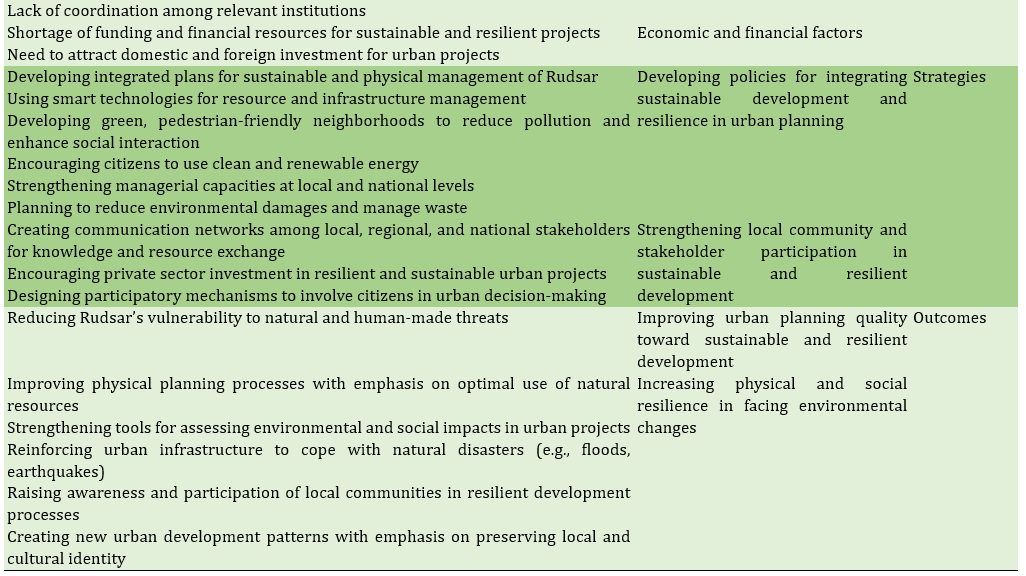 The absence of integrated planning and the prevalence of unsustainable development have led to uncontrolled urban expansion, environmental degradation, social inequality, and increased vulnerability of cities to natural and economic crises. In the city of Rudsar, these issues have resulted in the destruction of natural resources, rising pollution, and a decline in the quality of life, thereby underscoring the necessity of integrating sustainable development and urban resilience approaches.