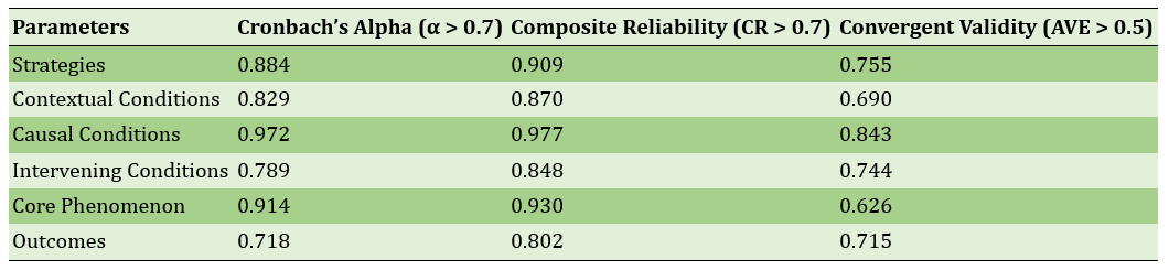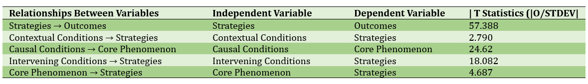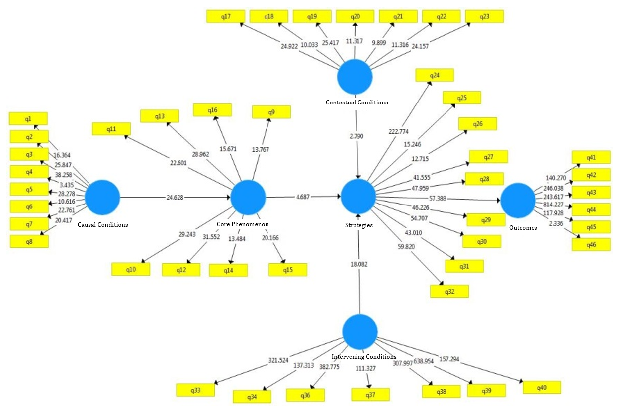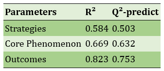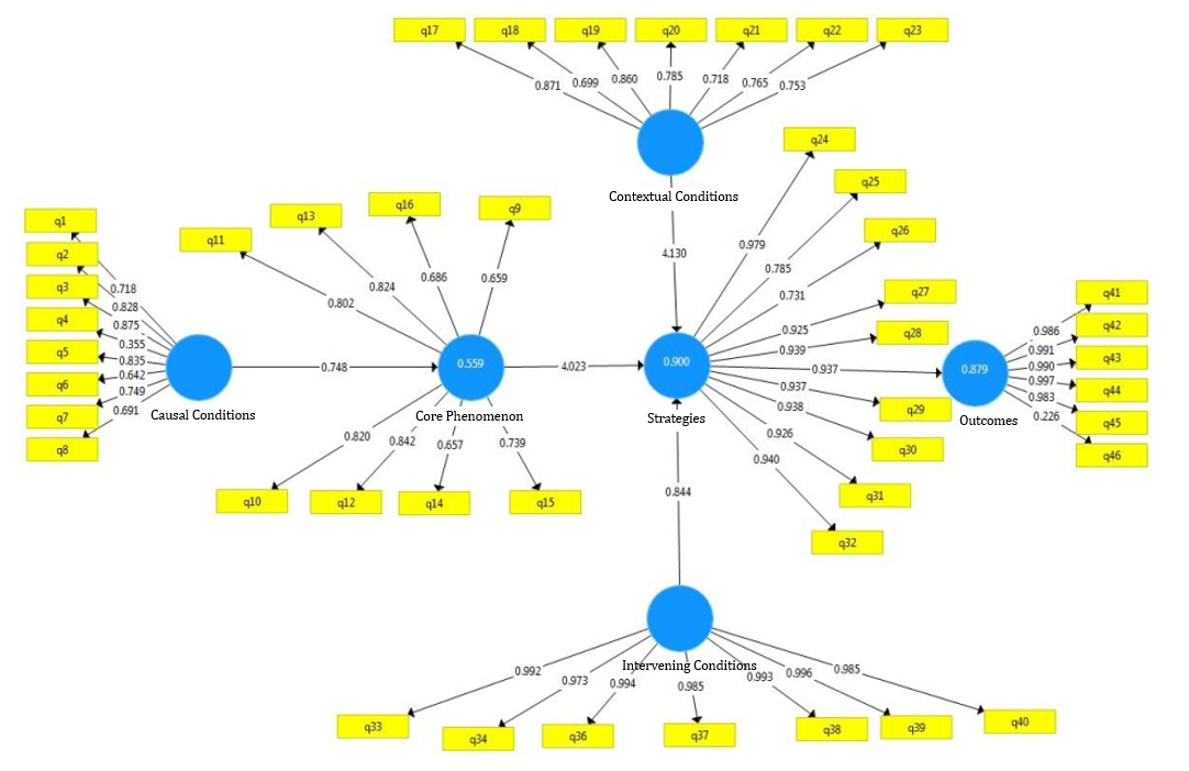 Composite reliability (CR) and average variance extracted (AVE) values also exceeded standard thresholds (Table 2). Evaluation of R² and Q² indices indicated strong predictive power, with the outcome variable showing the highest R²=0.823 (Table 3). Structural path analysis revealed all relationships between variables were significant; strategies had the strongest positive effect on outcomes (t=57.388), and causal conditions played the greatest role in explaining the central phenomenon (Table 4, Figure 3).