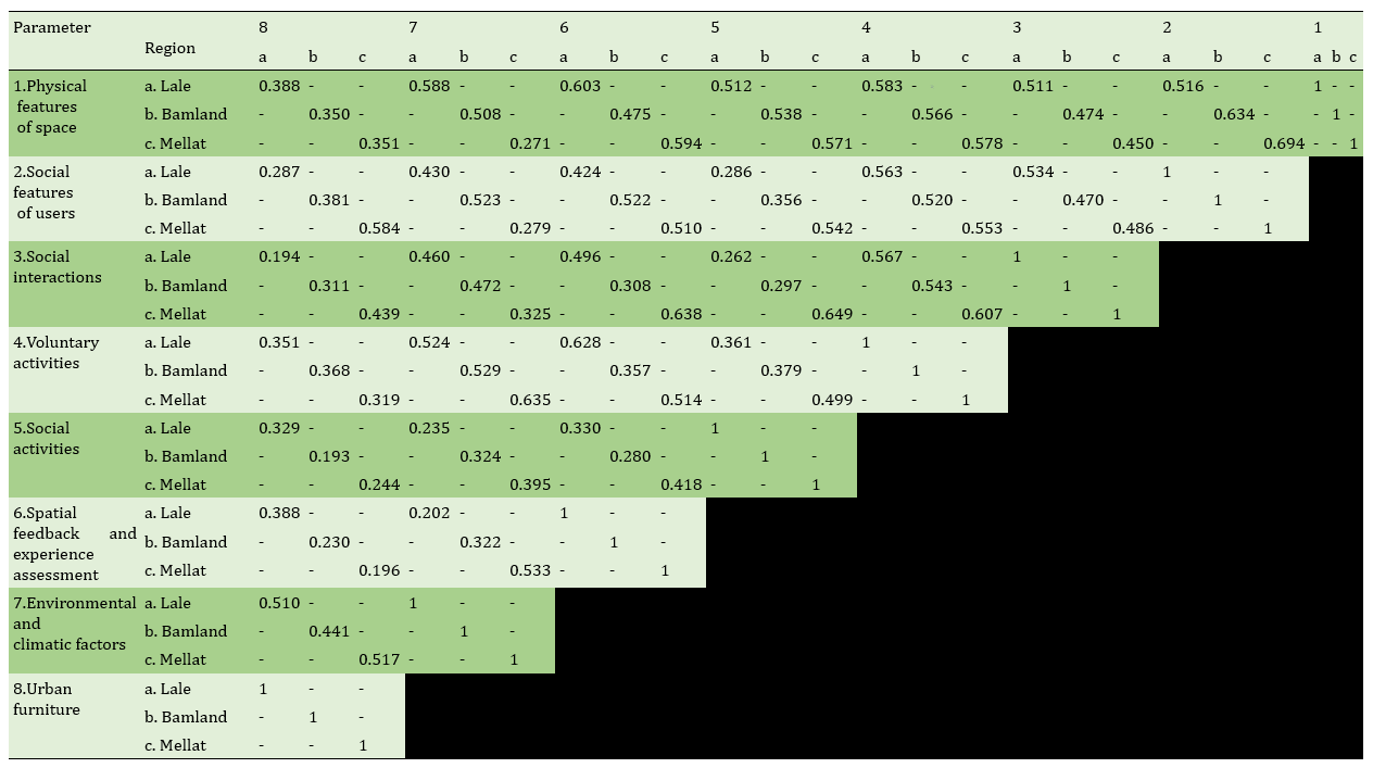 Pearson correlation analysis revealed that most behavioral, physical, social, and environmental components were positively and mutually correlated (Table 1). For example, in Laleh Park, physical characteristics were strongly correlated with discretionary activities (r=0.583) and spatial feedback (r=0.628); in Bamland, users’ social characteristics were associated with environmental–climatic factors (r=0.523); and in Mellat Park, social interactions showed high correlations with social activities (r=0.649) and spatial feedback (r=0.638). Overall, the results indicate that the interaction between the physical quality of space and users’ social behavior is the most important factor in shaping a positive spatial experience, and spaces with optimal design, appropriate amenities, and favorable environmental conditions enhance social participation and user satisfaction.
