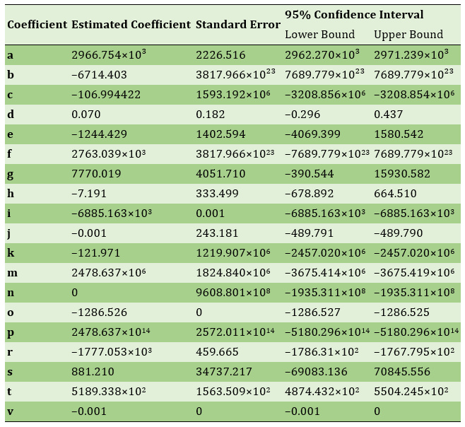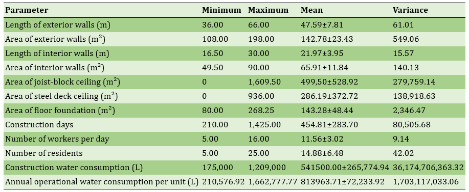 In this study, the water performance of residential buildings was initially modeled by extracting physical characteristics, construction data, occupant attributes, and water consumption in both construction and operational phases for 64 apartments. In the first step, descriptive statistics of water consumption and building characteristics were reported, showing that the average construction water consumption was 33.3% higher than annual operational water use (Table 1). Construction water consumption was then modeled based on physical features. Nonlinear regression results indicated that variables such as the area of exterior and interior walls, area of joist-slab and steel deck ceilings, foundation floor area, construction duration, and number of workers had significant effects. The final model, with a determination coefficient of 0.986, predicted 98.6% of the variance in construction water consumption (Table 2).