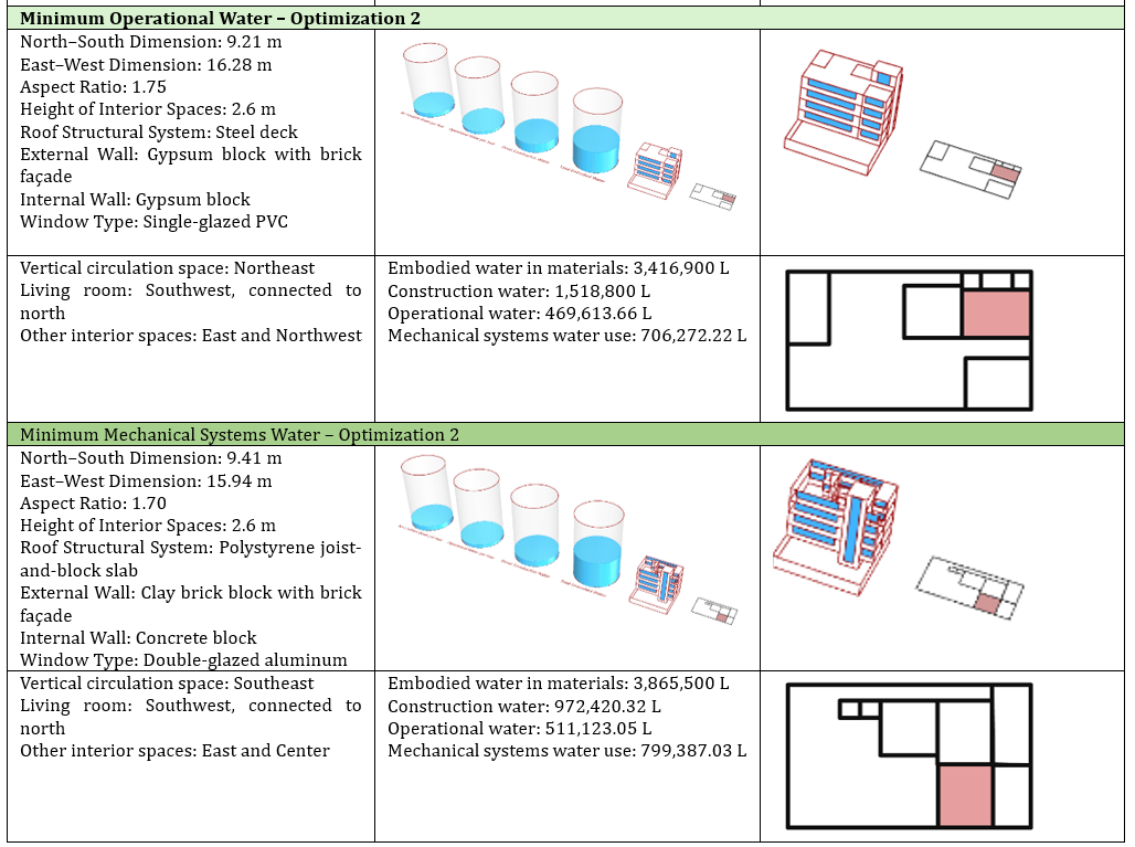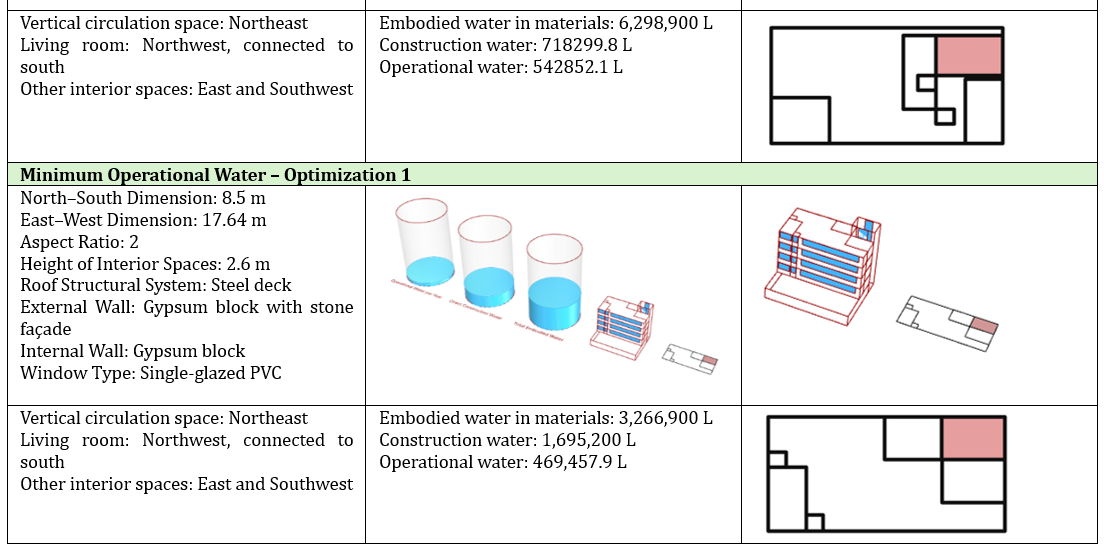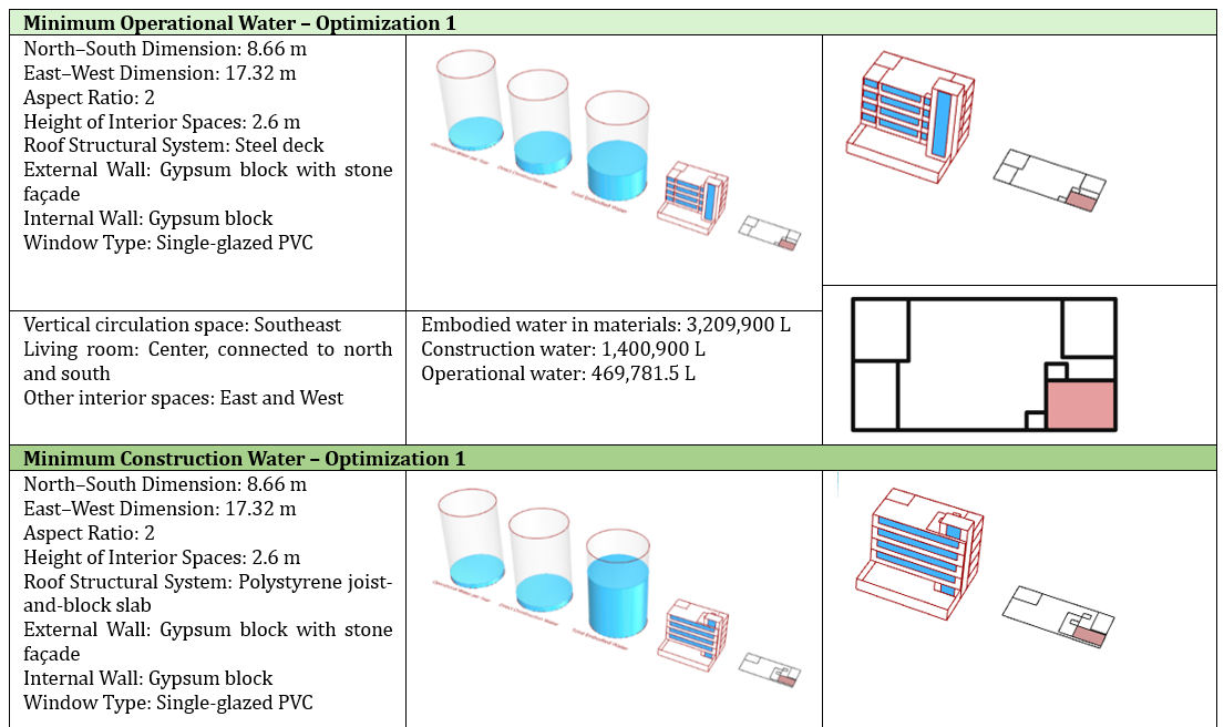 The optimization results identified a configuration measuring 8.66 m (north–south)×17.32m (east–west), internal height 2.6 m, steel deck, exterior gypsum block wall with stone cladding, interior gypsum block walls, and single-pane PVC windows, which achieved the lowest embedded water consumption (3,209,900 liters) along with favorable construction and operational water use.