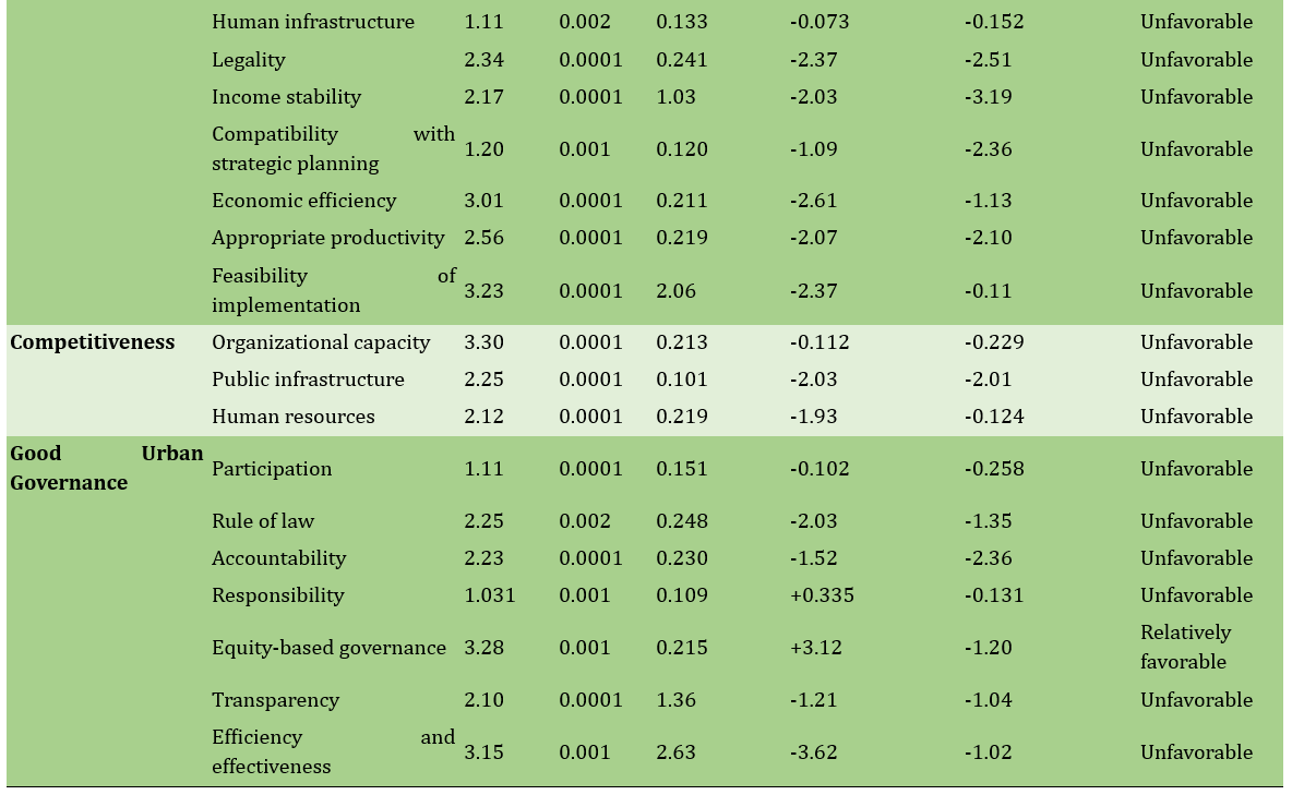 Regarding the competitiveness index, the criteria of organizational capacities, public infrastructure, and human resources with respective mean differences of 0.213, 0.25, and 0.219 demonstrated undesirable conditions, as reflected by T-values and confidence intervals lower than the expected range. Within the good urban governance index, only the criterion of equity-orientation showed a relatively favorable status, while the remaining indicators, based on the results of the T-test, were in unfavorable conditions. The participation criterion was assessed to be inadequate due to the lack of willingness by the municipal administration to involve citizens in urban affairs, and simultaneously, citizens themselves, due to low awareness and limited mechanisms, were not actively involved in city management. This combination has led to no effective structures for community participation in urban development. In addition, the findings point to a general lack of accountability among urban managers and city authorities in this region, which has contributed to an increase in urban administrative corruption. The rule of law, while not in a critical state, was found to be unfavorable, primarily due to the lack of public education and cultural development, which prevents the emergence of a sense of citizenship and belonging. Although not in a state of crisis, the legality indicator remains a limitation. Similarly, responsibility and accountability among city officials were rated poorly and are considered constraints in fulfilling the requirements of this index. Following the identification of strengths, weaknesses, opportunities, and threats based on expert opinions, participants were asked to perform pairwise comparisons. The absolute weights of the criteria were calculated using the SWOT method, and the relative weights were obtained using the Analytic Network Process (ANP). The results of prioritizing the strengths and weaknesses, along with the internal factor evaluation matrix, revealed that within the strengths group, factor S5 (“Presence of fruit-bearing trees in orchards”) had the highest relative weight (0.154), whereas S1 (“Favorable climate conditions”) received the lowest relative weight. In the weaknesses group, factor W1 (“Poor asphalt and numerous potholes”) had the highest weight (0.171), while W2 (“Inadequate medical facilities”) had the lowest (Table 2).