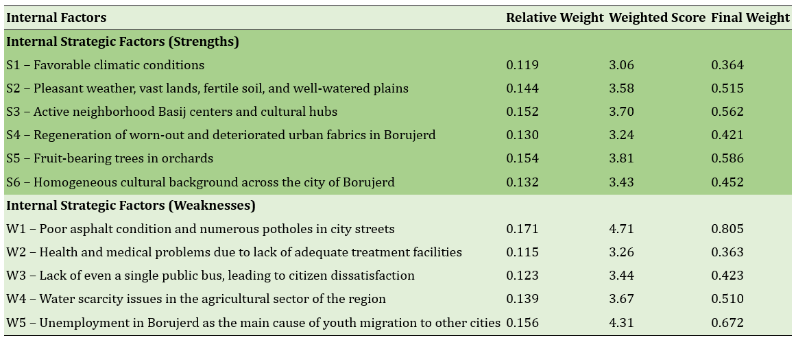 From the experts’ perspective, six factors were identified as strengths and five as weaknesses in Borujerd city. Among the strengths are the pleasant climate and tourism capabilities, which have a direct impact on increasing travel rates to the city and thus economic prosperity for local residents. Renovation of the worn-out urban texture is among the strengths, which enhances the quality of the urban environment and thereby improves residents’ quality of life. Gorginia and Amini [2022] noted in their research the effect of worn-out texture reconstruction on improving the quality of the urban environment. In assessing internal strategic factors, despite a slight difference between the weakness score (0.140) and the strength score (0.138), the weakness score is higher. This study identified five factors as weaknesses. The poor condition of pavement and numerous potholes in city streets, unemployment, water scarcity in the agricultural sector, lack of public transportation, and shortage of medical facilities are the weaknesses among internal strategic factors. These weaknesses influence each other. For example, solving the water scarcity issue in agriculture would boost business in that sector and partially affect employment and unemployment reduction. This would indirectly have a positive effect on reducing migration problems. On the other hand, strengthening transport infrastructure would create traffic safety and resolve issues such as private vehicle use and traffic congestion (which directly and indirectly impact visual and noise pollution), consequently enhancing quality of life.