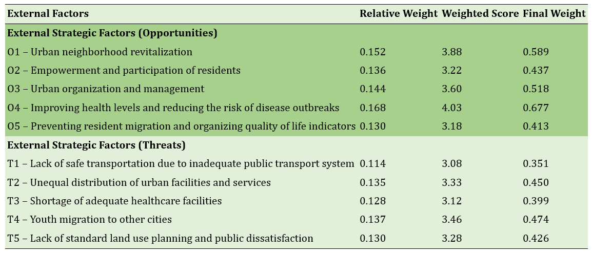According to Table 3, sustainable development aimed at neighborhood revitalization and urban planning and management, with weighted scores of 0.152 and 0.144 respectively, are considered the most significant opportunities in the studied area. Additionally, the migration of young individuals to other cities, migration to Borujerd due to the lack of adequate medical facilities, and the absence of standard urban land uses in different districts, along with public dissatisfaction, are identified as the most critical threats in the region, with weighted scores of 0.137, 0.135, and 0.130, respectively.