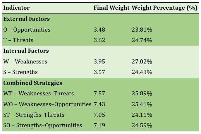The final weights of internal and external factors, shows a higher score in the Weakness–Opportunity (WO) quadrant.